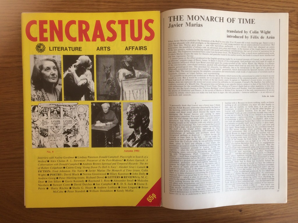 All three excerpts were published a year later in the Edinburgh-based literary magazine Cencrastus. I believe it was the first example of Javier Marías’s work to be published in English. It did not attract much, if any, attention because Marías was almost unknown in the UK – almost as anonymous as me.