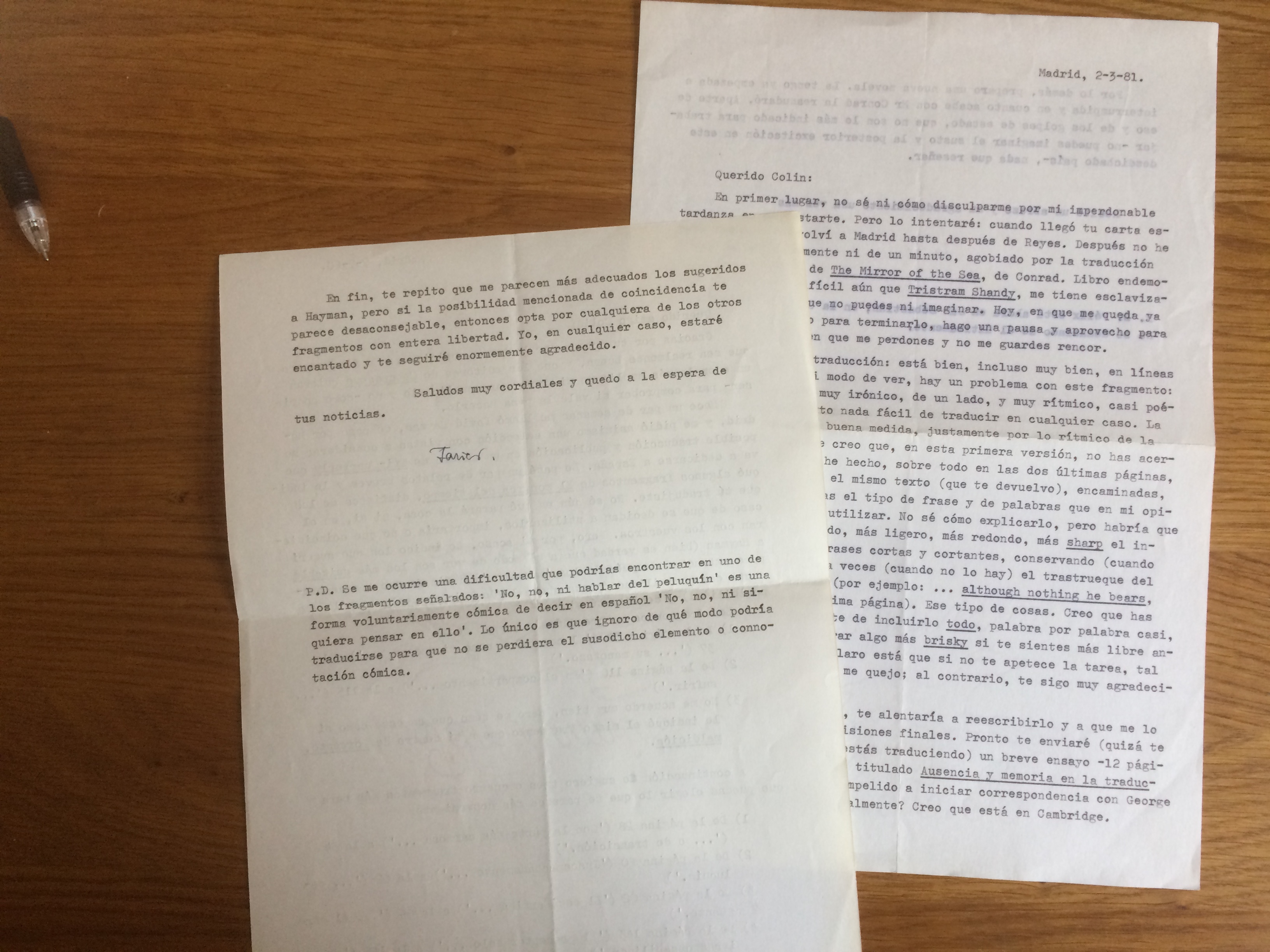 Taking advantage of an introduction from Félix de Azúa, a writer I’d collaborated with at Oxford, I arranged to meet Javier Marías, who had written several novels and translated Tristram Shandy into Spanish (while still in his 20s), and was now having a crack at Conrad’s The Mirror of the Sea.