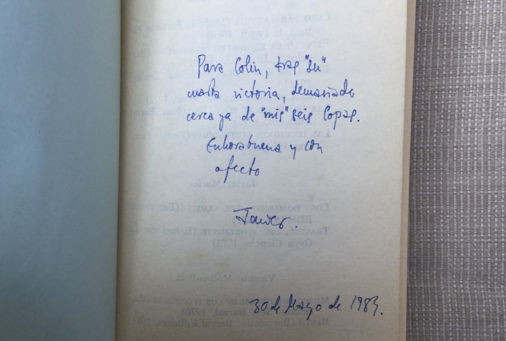 Marías suggested some short passages I might translate into English from his latest novel, El monarca del tiempo (The Monarch of Time) for an article I had been planning. He generously wrote, in Spanish, on the flyleaf: “To Colin Wight, after a long and interesting chat, with confidence that it will be repeated”. A few days later I took the train from Madrid to London.