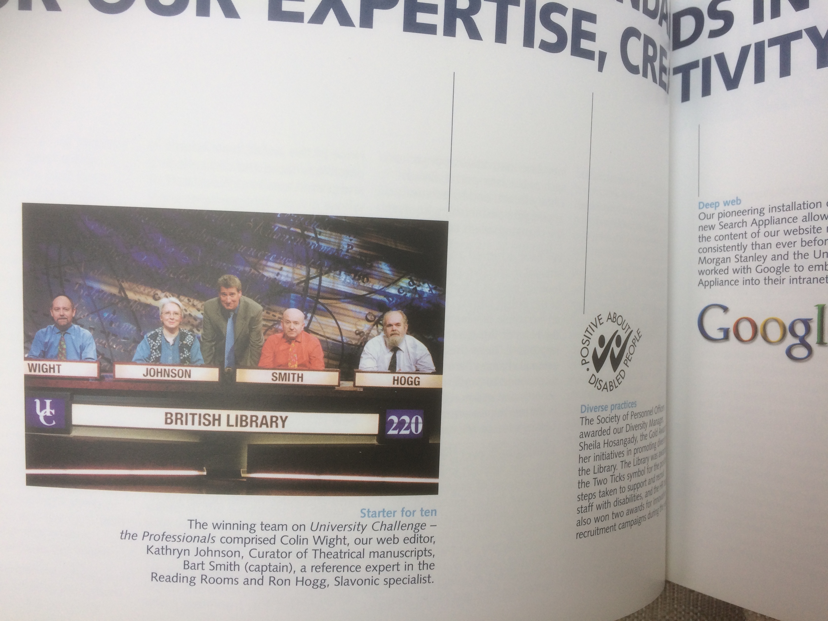 I’d been at the British Library for over 17 years when our Press Office agreed to take part in a special 2004 edition of University Challenge, called “The Professionals”. I just had to go for it. I took an exam and made the team, joining three other northerners, all a bit old, a bit over-weight and generally lacking in physical charm. You could imagine the marketing director thinking, “Oh dear. We have some rather photogenic young curators, so how did we get lumbered with this lot?” In fact, I am sure that’s exactly what she said – though not directly to us. But of all those who wanted to take part, we were the four who performed best in the tests. It transpired that three of us had been on UC as students, all of us waiting for a second chance.