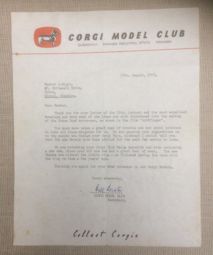 One of my Corgi cars was an Aston Martin. In the film of Goldfinger, which came out in 1964, Bond (Sean Connery) was given a highly-adapted DB5 by Q to drive. I said to Eric that we should write to Corgi and ask them to bring out a model of Bond’s car. Eric set about the drawings, which were ambitious and impractical, showing how all Q’s on-board weapons would work. Brimming with the confidence of youth (I was only 10! I), I sent off a letter to the Corgi Club and got a nice reply, praising the drawings, but also pointing out that their models were fixed for quite a while to come.