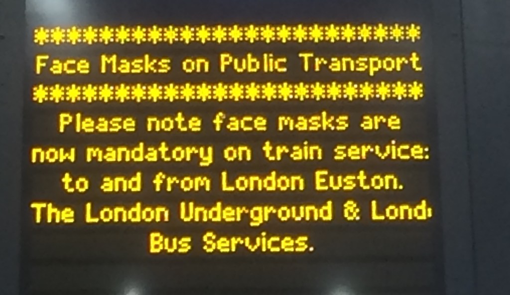 A saw a large man with “here to help” on his uniform. Was I supposed to feel comfortable asking him a question, even though he was not wearing a mask? He was talking to people from all over the country, many of whom had just been on a bus or the Tube. People were allowed to enter the stations and even go down to the platforms without a face covering, but were expected to put them on once they were on the train (where, especially on commuter services they will rarely encounter a member of staff to make sure they do so).