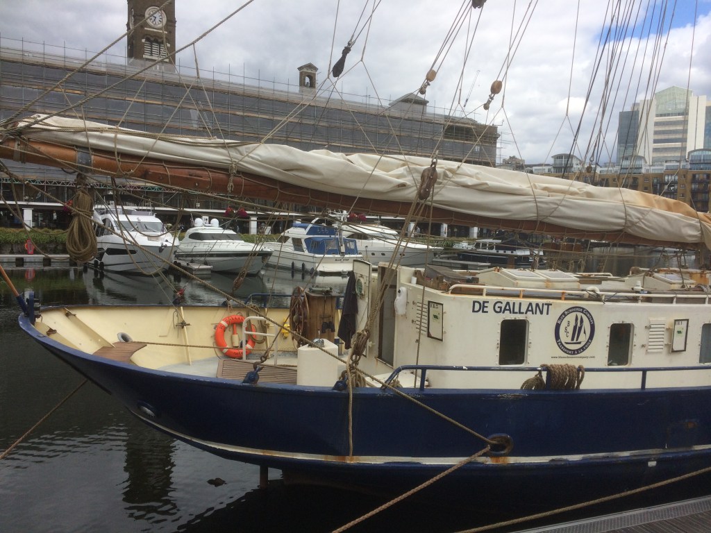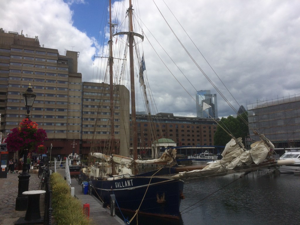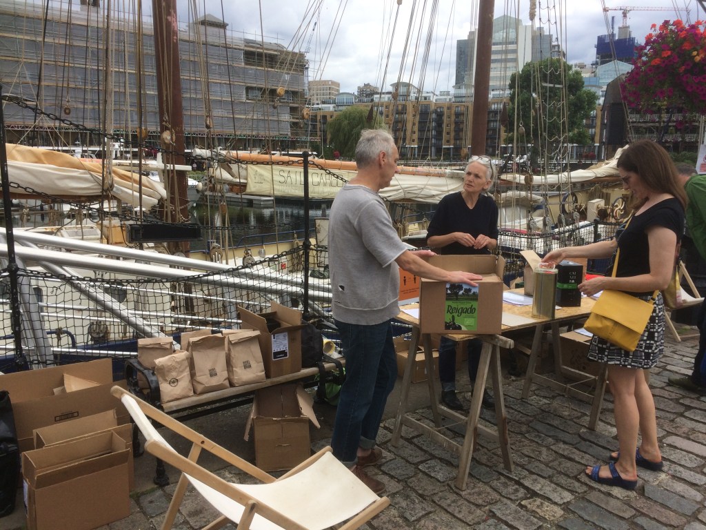 These days, with olive oil no longer considered exotic, the answer might be Sainsbury’s or Tesco, or even Aldi. Not that I’m boasting, but ours comes by sailing ship from Portugal. Last Saturday being a fine day with a slight breeze, we cycled to St Katharine’s Dock (where Anne has her office, not that you’d know these days) to pick up our latest delivery. It’s less than five miles and downhill/flat the whole way. Of course that means it’s flat/uphill on the way back but such is life.