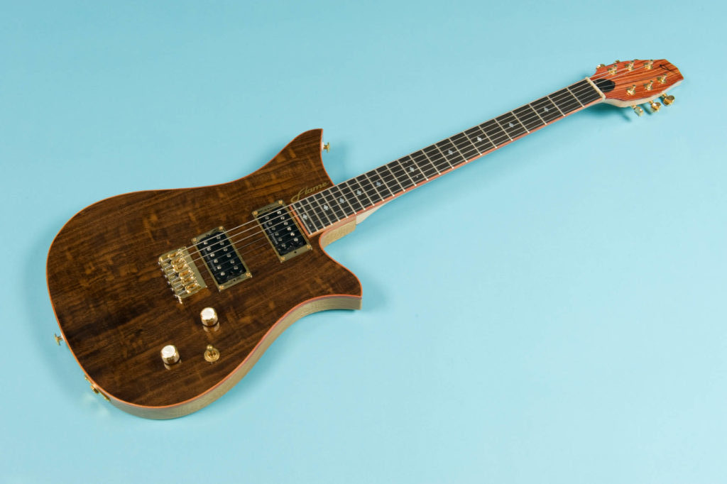 The top is imbuya on a korina body. The fretboard is ebony and there’s also a small amount of tulipwood, maple and mahogany in the body. That makes it look pretty but the choice of woods does genuinely affect the sound. What I want of an electric guitar, at least sometimes, is sustain.