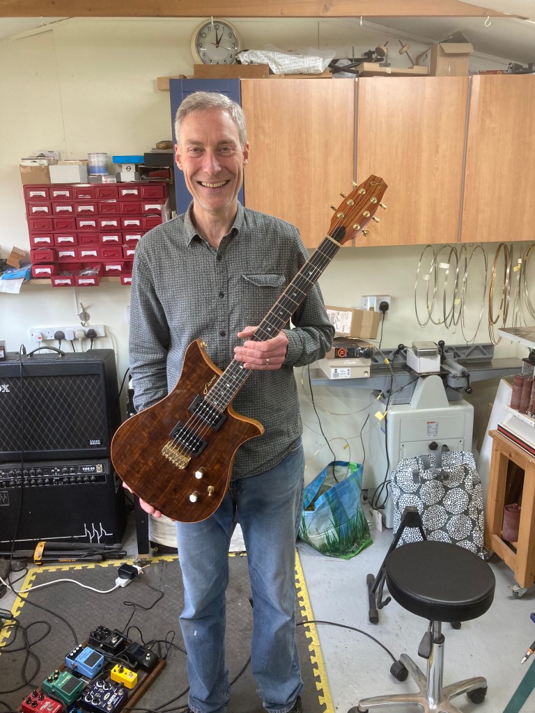 Except that I’ve always wanted a hand-made guitar. And after all you can’t take your money with you, can you? Just think of my poor Mum and Dad in a care home without a guitar to their name. I proudly present my Flame F2, made by ex-fireman David Kennett in his Sutton workshop. This one was ex-demo, although perfect, so an absolute bargain.