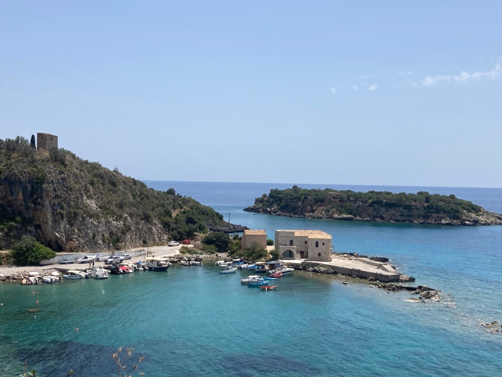 After four nights we moved on to Kardamyli. This ancient village, apparently mentioned in The Iliad, has gone from strength to strength. The medieval castle (Mourtzinos) has been renovated and there are now some impressive modern restaurants, though the traditional tavernas are still going strong. Again, you can jump off the rocks into clear water, with the additional attraction of being able to hike through the old village and into the hills. It’s hard going at first but you are rewarded with views of the coast, and the perfume of wild herbs and the sound of birds and cicadas as you make your way along shepherds’ paths and kalderimia and through the woods to discover springs and streams frequented by flocks. Quite wonderful. You would have no idea from the village below of how revealing such a walk can be.