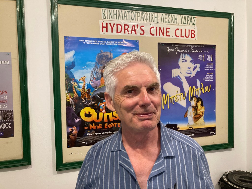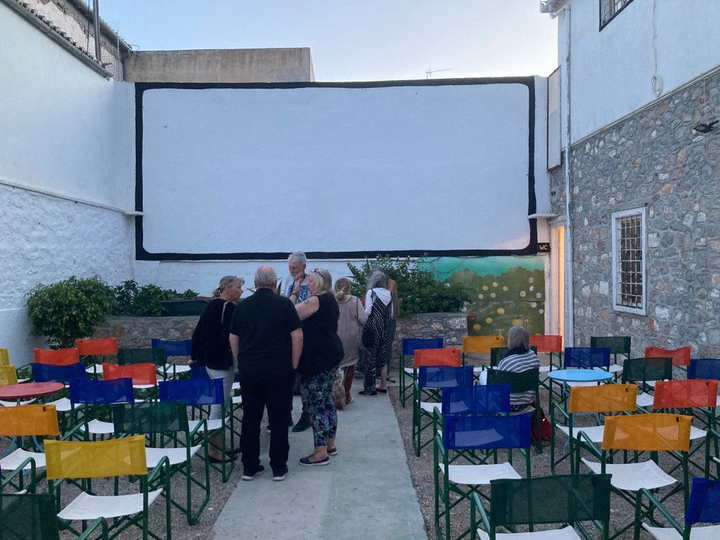 One evening, having staggered round the island with an all-day hangover, we were heading back to our room when I spotted an outdoor cinema just up from the harbour (there are no main roads, apart from along the coast, because the island is closed to motor traffic). We entered out of idle curiosity and met the owner/manager/curator – I never found out which. I told her that I vividly remembered visiting a cinema just like that in Loutraki, on that infamous school trip 51 years ago. They were showing the stop-motion classic, Jason and the Argonauts. (I had the privilege of meeting director Ray Harryhausen, by then a resident of London, many years later when working at the British Library.) She lamented the decline of the “summer cinema”, where you could watch a film al fresco, order a drink and a snack, and get terrorised by the dreaded gnat into the bargain. Was there a film showing that night? Unfortunately not, but the venue had been hired by Dutch enthusiasts for a Cohen memorial gig.