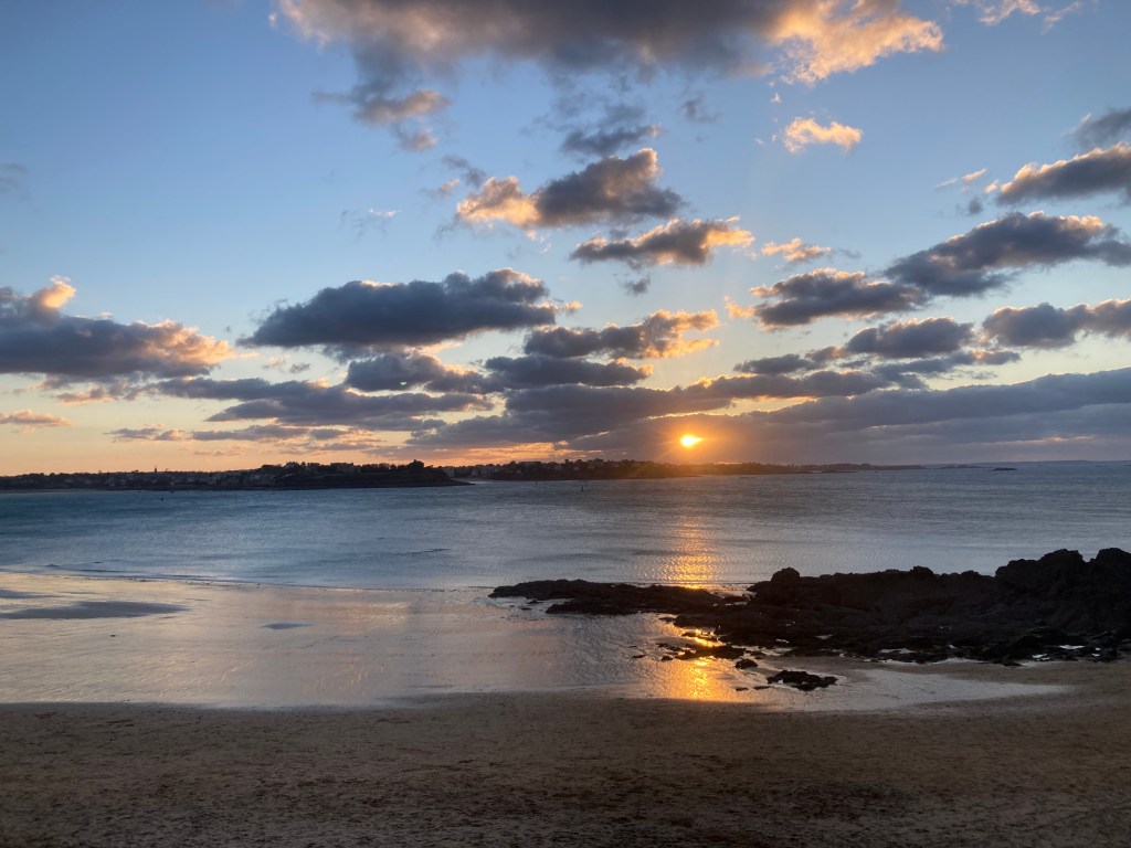 We take the road north through Aulnay, with its Sunday market and superb Romanesque church. We have been there before, at least 20 years ago. A worthwhile detour. The stiff cold wind never lets up, and by the time we reach Saint-Malo, four hours later, it is blowing a gale and freezing to boot. And so, after an excellent dinner at the quaiside, to bed.
