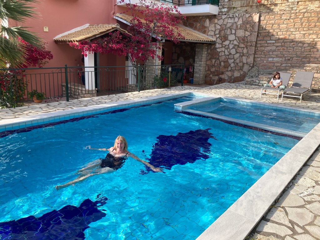 So to our next accommodation: the 1970s Pineas hotel on the edge of town with – a great boon in the heat – a large swimming pool. Lots of locals use it too but there was not another English tourist in sight.