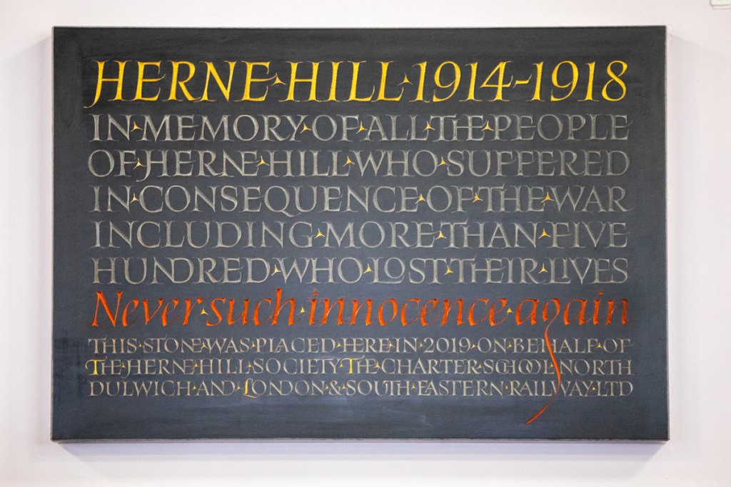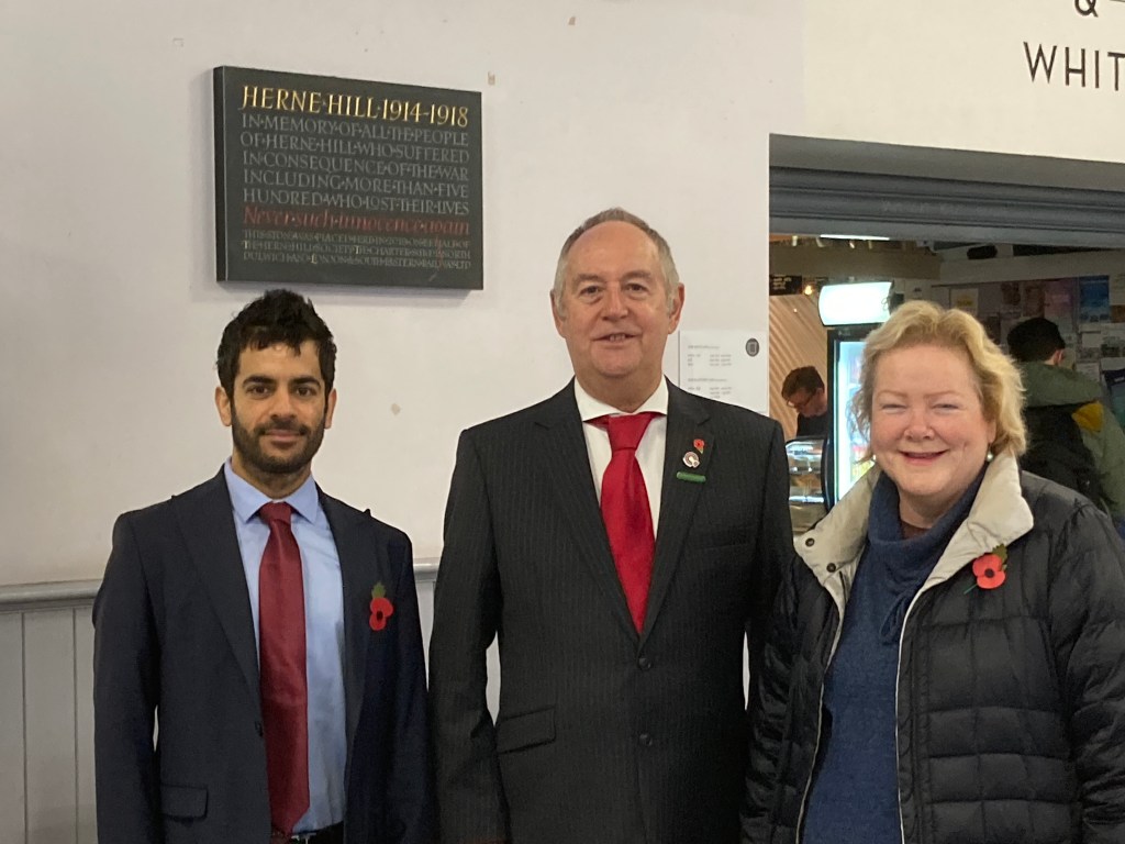 On Sunday 12 November I laid a wreath on behalf of the Herne Hill Society at our First World War memorial in Herne Hill Station. There was a respectable turnout of 25, including our Chair, Rebecca Tee and two Lambeth councillors. I sometimes have to explain that – at least in our case – it is not religious or political event that seeks to glorify war, or turn soldiers, whether conscripted or volunteers, into martyrs. Words such as king, motherland, God, sacrifice, democracy, duty and freedom are all absent from the memorial stone. It marks the death of over 550 local people, as well as the misery the war inflicted on the survivors, not least those of German origin or with German-sounding names who were verbally or physically attacked.