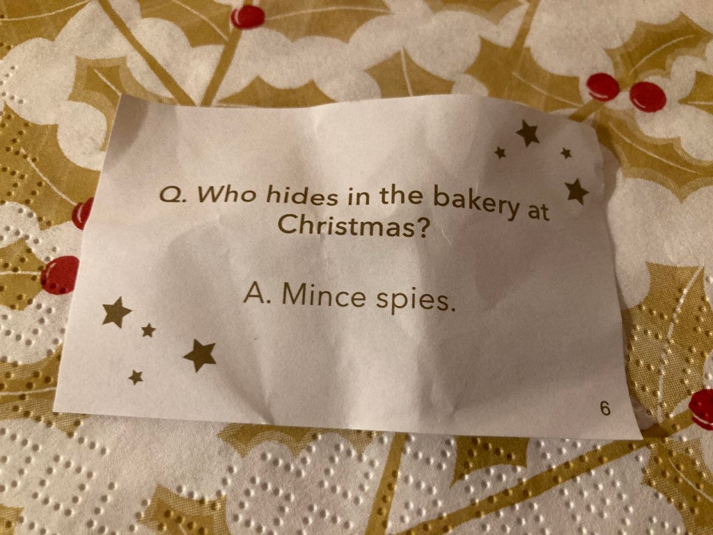 And so, with no working oven at home, Christmas dinner was relocated to my father-in-law’s flat, just down the road. First we had a pint in our local, The Half Moon – on the house, thanks to the generous manager, Matt. Dinner went well, thanks to Anne’s careful planning. Then Norovirus struck. More than enough excitement, if less eating, as it turned out.