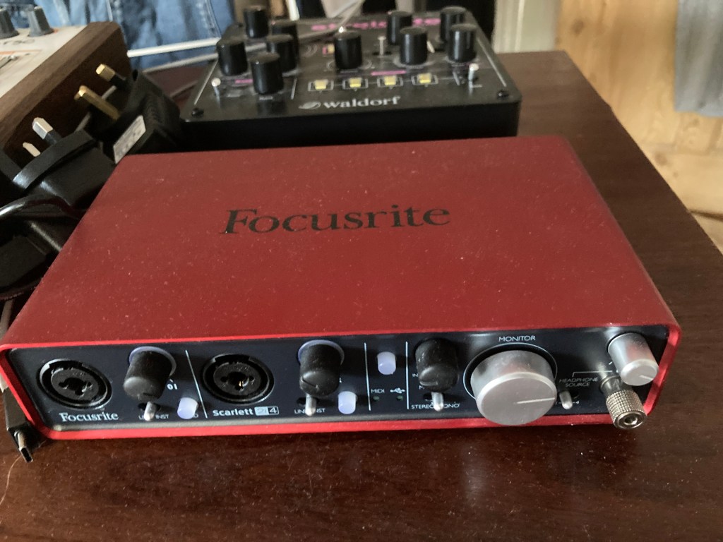 You must have an audio interface to plug your instrument/s into, with the output going into GarageBand or alternative “DAW” on your computer. Whether it’s a microphone, a guitar, a keyboard or whatever, you need that little box to convert the sounds that our ears hear into 0s and 1s. I have a Focusrite Scarlett with two inputs. The latest version costs just shy of £200, but you can get one second-hand on eBay for less. Get one with at least two inputs, because often keyboards have stereo outputs (left and right hand) that you will want to record on separate tracks at the same time.