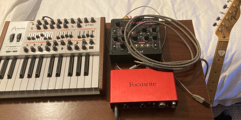 In this set-up I have an electric guitar plugged into the box, which will then be connected to my laptop via the grey USB lead you see at bottom right. I have a string synth and keyboard standing by for a later overdub.