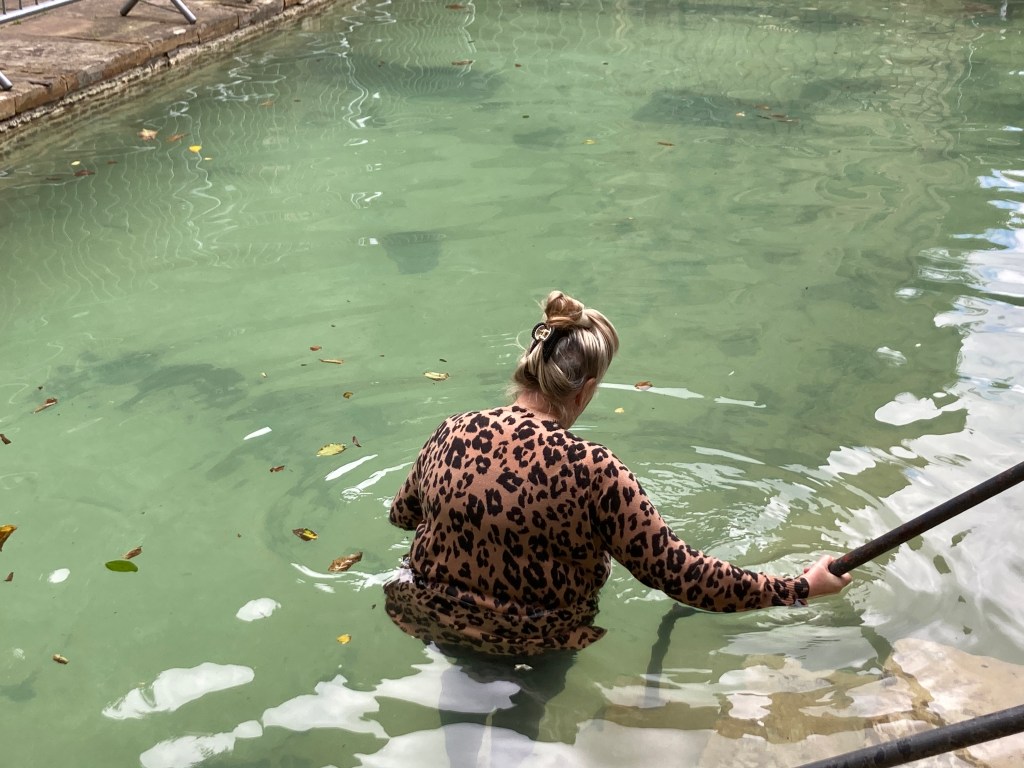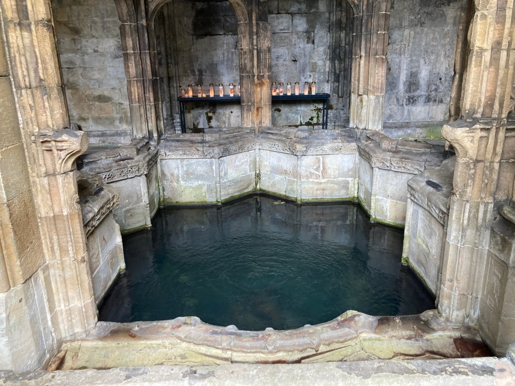 Underneath the 16th-century Gothic chapel is the crypt and the holy well itself; outside is the pool that pilgrims come to bathe in. The water is very cold (I dared to dip my hand in). While I was there, people were arriving to immerse themselves. One couple, who I think were Irish travellers, were dipping a young boy wearing a hearing aid who seemed to have behavioural problems. Another child who had already been in the water clearly did not want to enter a second time! Another middle-aged couple had a Scottish accent.
