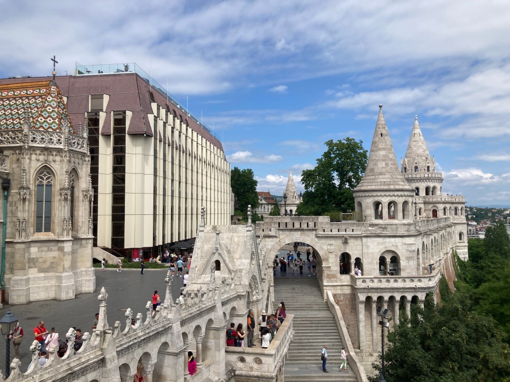 More unabashed tourism. The No.216 bus took us across the chain bridge to Buda and up to Castle Hill, where visitors thronged into and around Matthias Church (heavily restored) and the Fisherman’s Bastion (which has nothing to do with fishing).
