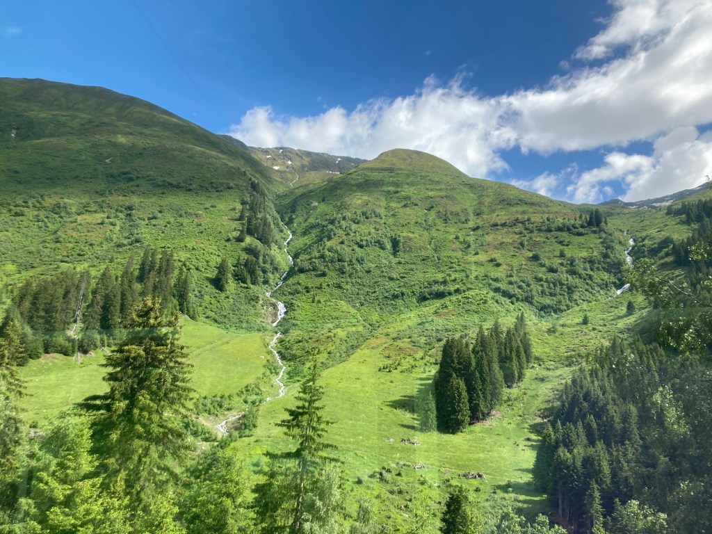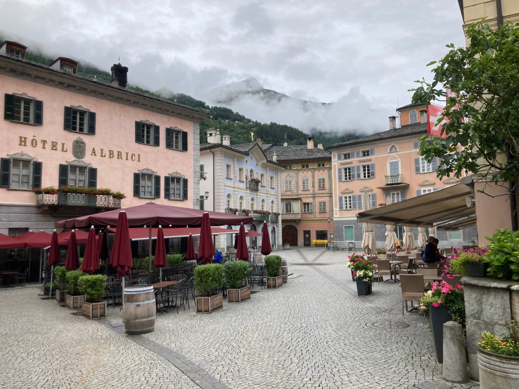 Perhaps even quieter than Austria… but after a fruitless walk through this prosperous-looking little town we finally came across a restaurant that was open. It was a relief to escape the rain. The staff at Bistro Semadeni were helpful and welcoming, and we enjoyed delicious minestrone and spaghetti carbonara while charging our phones (note: Swiss electrical sockets are not the same as in France or Italy).