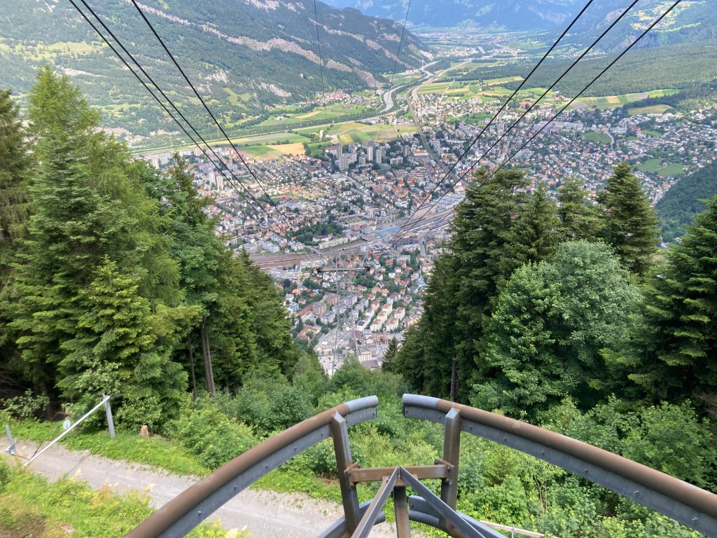 Another change in the weather: a clear, sunny day. After a tour of the old town we walked to the Brambrüesch cable-car. The second part of the ascent is in a scary, and rather old, little gondola. A fellow passenger was nearly sick when we set off.