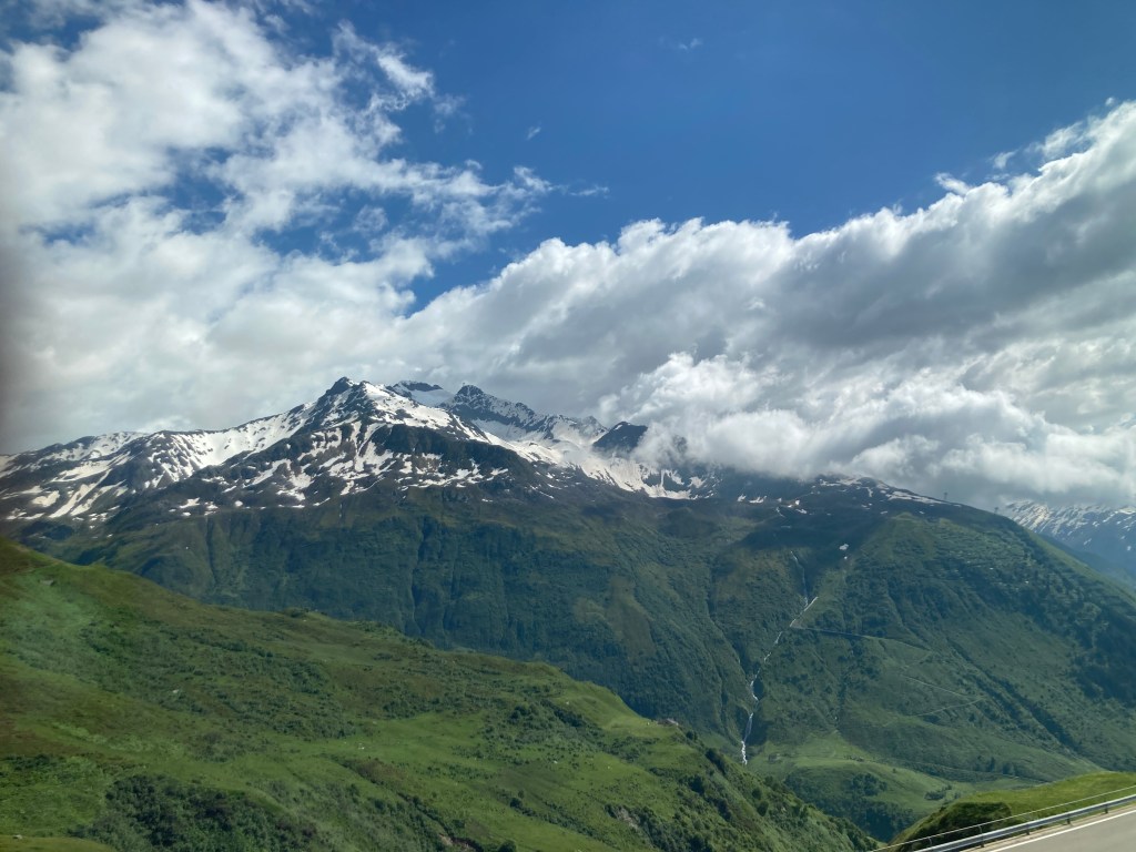 The fine weather held as we followed the course of the Rhine, its swollen waters thundering beside us, then headed into the Alps.