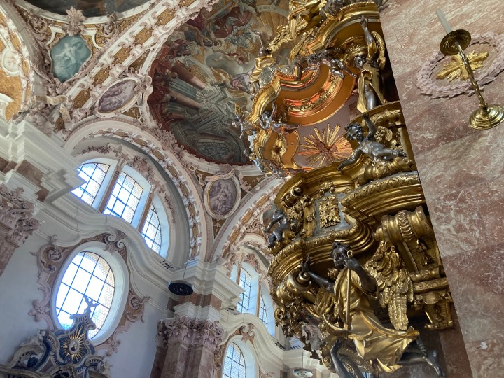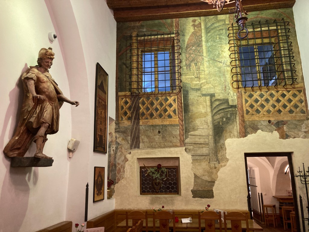 Instead we popped into St Jacob’s cathedral then headed towards the famous Goldenes Dachl: basically, a medieval royal box situated on the main crossroads of the Altstadt. We arrived to hear medieval fanfares being played from the balcony. We were fortunate to find a table in a restaurant from which we could enjoy a cold beer in the sunshine while listening to the musicians. Exquisite and, once again, not expensive. Why food and drink in Austria are a third of the price of Switzerland I do not understand.