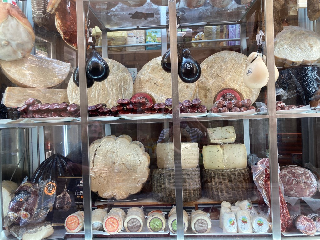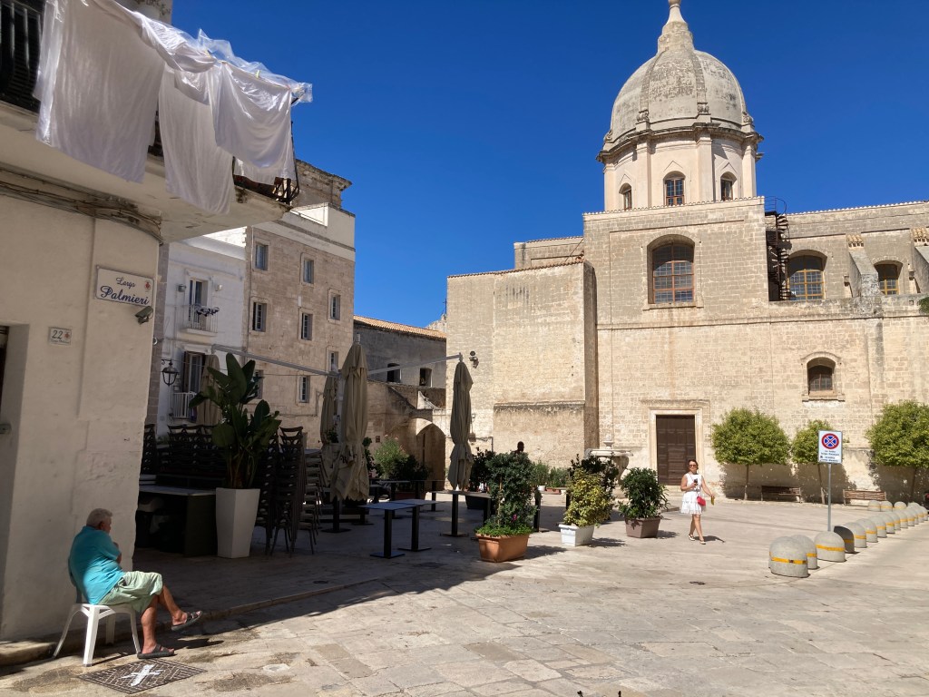 It was time to get a week’s washing done and hung out to dry; then a walk up to the Primi Numeri supermarket for provisions. We returned through the winding streets and traffic-free squares for lunch on the terrace: salad, bread, olives, prosciutto crudo and gooey gorgonzola, accompanied by delicious primitivo wine. Superb.