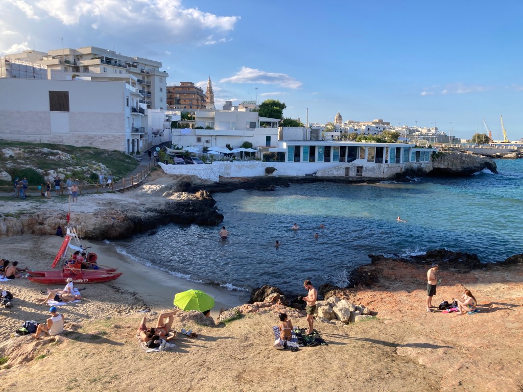 Having changed for a swim, I found the tiny beach to be stony, slippery and heaving with bathers, so decided not to bother getting into the water! We had a beer, then turned around and got the next train back to Monopoli. We spoke to a Dutch couple who were doing likewise.