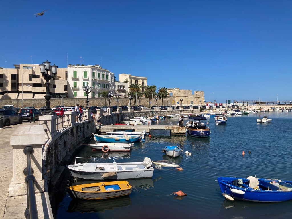 Our apartment, hidden in an alley between the port and the main square, Largo Giuseppe Garibaldi, was tall and narrow: three floors connected by flights of steep marble steps. If not quite a death-trap, moving around it was a challenge, especially with luggage and a dodgy ankle. On the plus side, it was well appointed and had an open roof terrace with sea views.