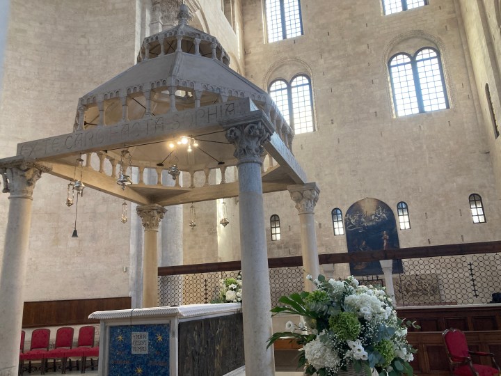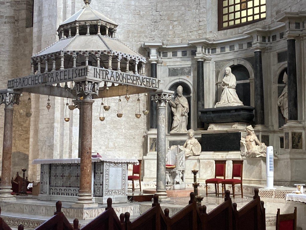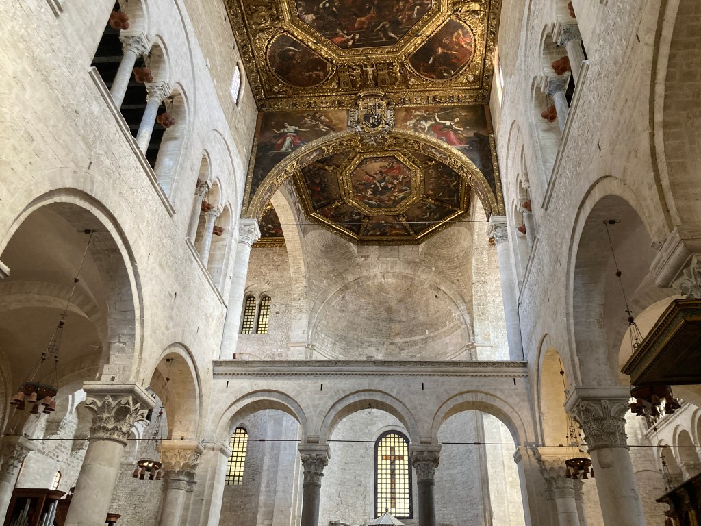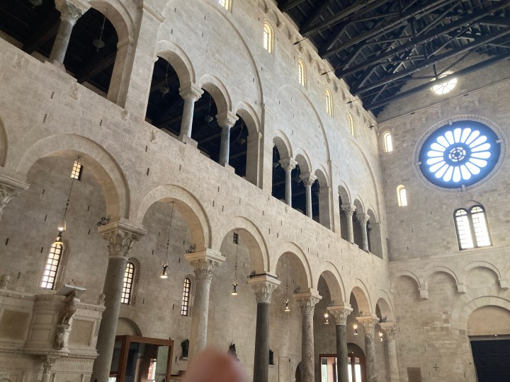 We went because it was a convenient place to catch the Flixbus to Rome, but it certainly merited the stopover. It has many art-filled churches, most famous of which is the Romanesque Basilica San Nicola, a huge castle-like building that claims to contain the relics of St Nicholas. It is a popular pilgrimage destination for Russians, as we noticed.