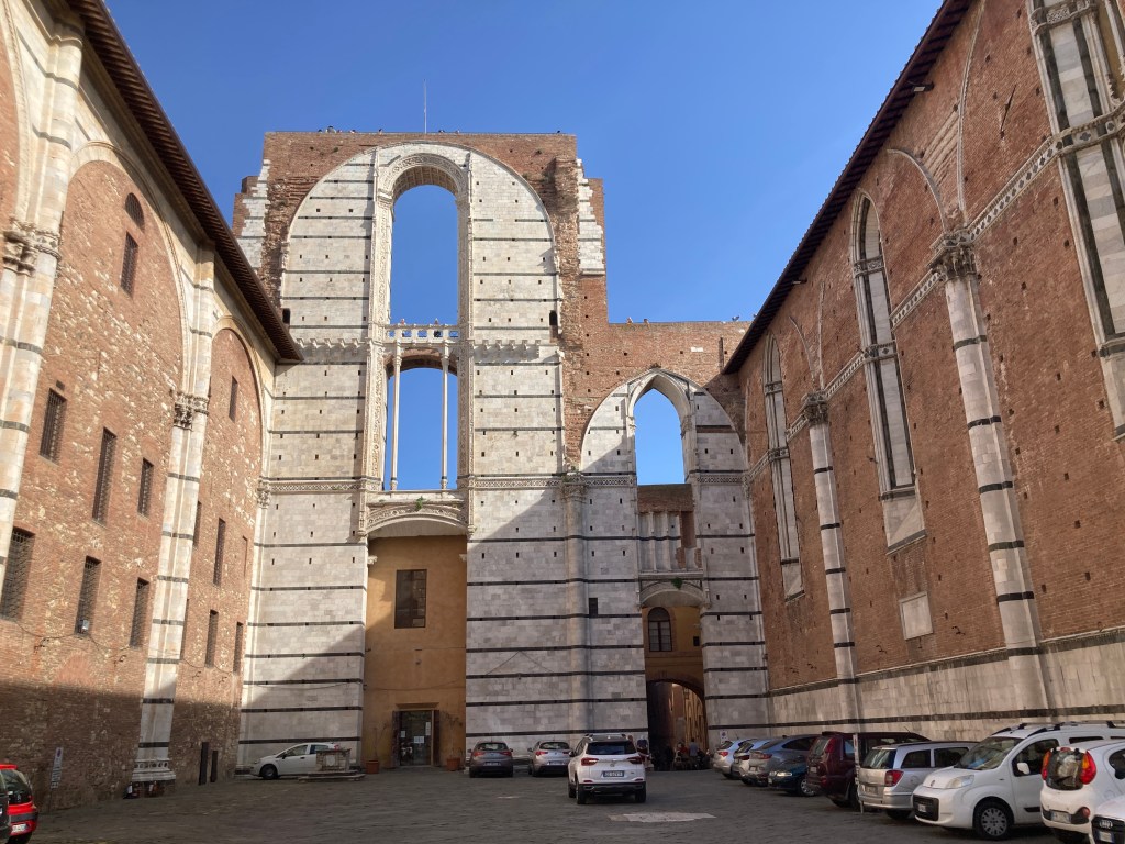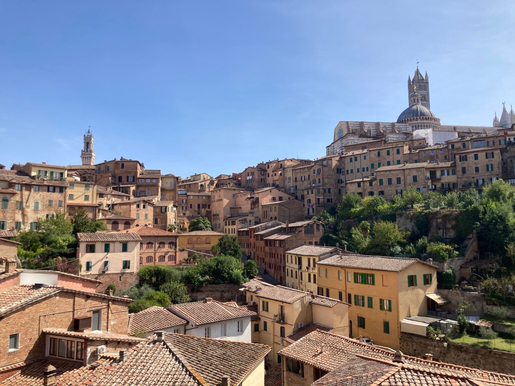 Five minutes’ walk took us from the Beehive Hostel to Termini to catch the 09:10 Frecciarossa to Firenze SMN; whence we boarded a comfortable regional train to Siena, travelling through enticing Tuscan countryside and arriving at 12:48. From the station we picked up a bus to the edge of the old town (no cars allowed within), paying by tapping in with a bank card. The S9 took a tortuous route through a couple of housing estates before returning to the station (that was a surprise!), then retracing its steps rather disconcertingly before finally depositing us at Piazza Antonio Gramsci.