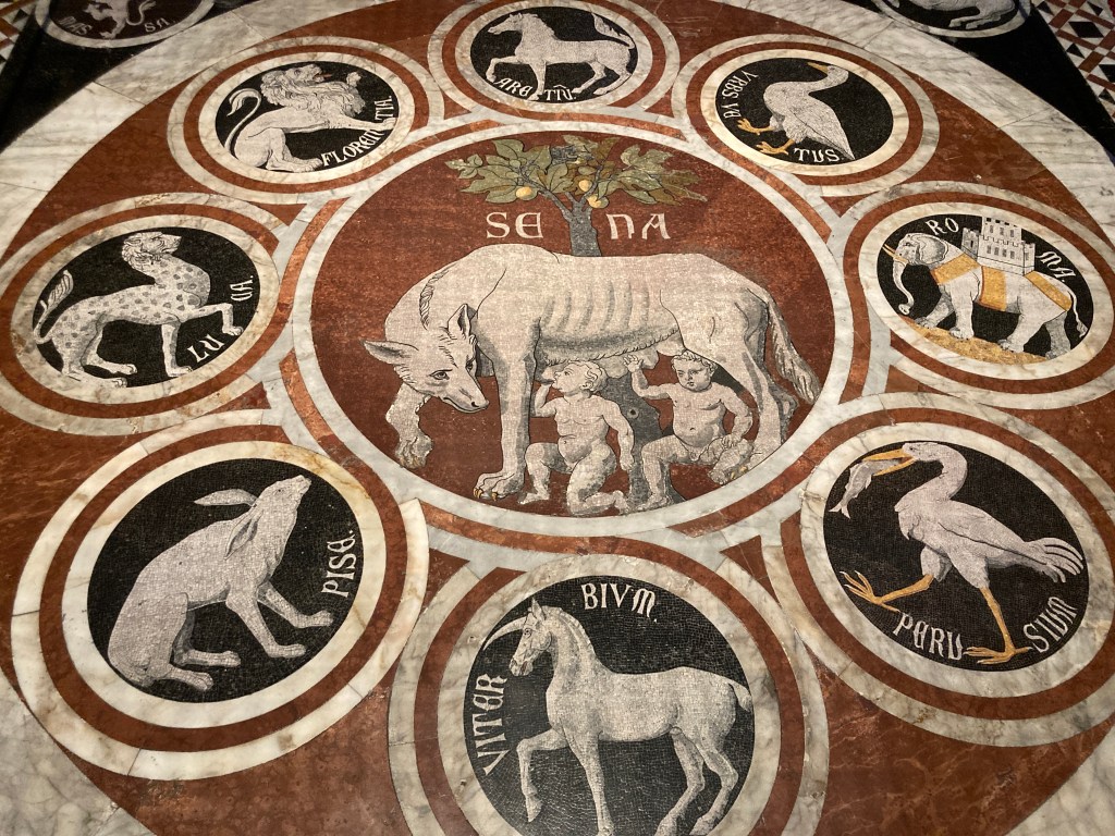Siena’s cathedral is a magnificent museum packed with medieval and Renaissance treasures. I will not attempt to describe its beauty; or the astonishing craftsmanship of the marble floor, chapels and pulpit. That’s what you see when you first enter; but there’s much more: the Piccolomini Library, a crypt with medieval frescos, and a baptistery, which includes sculptures by Ghiberti and Donatello. Every artist of note left their mark on the Duomo.