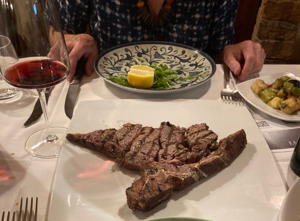 We celebrated the end of our two days in Siena with an excellent dinner in the grotto of Bagogo. Being epicurious and greedy, I began with a bowl of ribollita (bean, bread, and vegetable stew) before sharing a whopping steak with Anne. It was perfectly cooked and even better with a bottle of red wine. As usual in Italy, the bill was not as high as we had expected, and the service was great too.